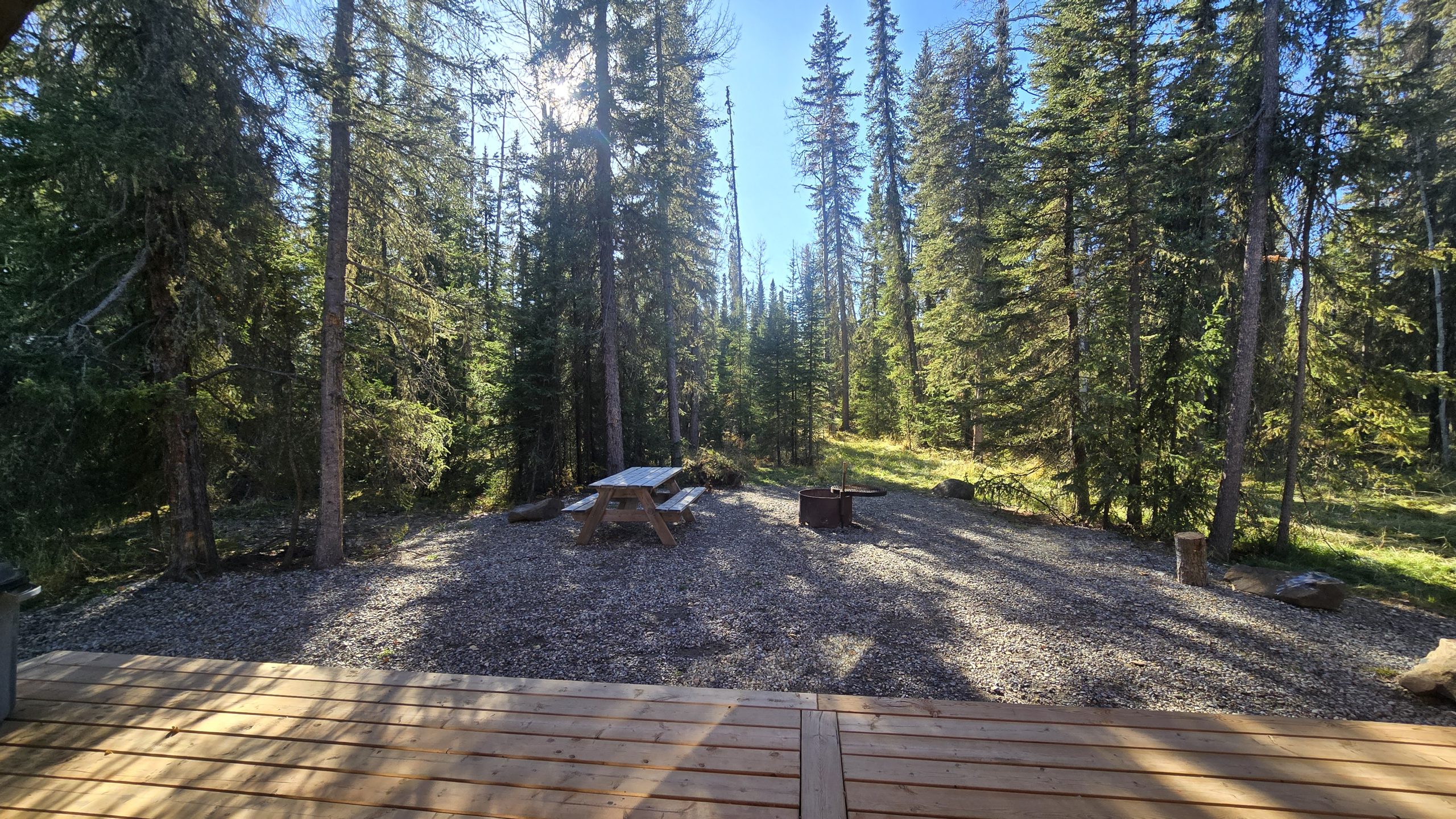 Fire pit and picnic table in front of the cabin, parking space beside the cabin.