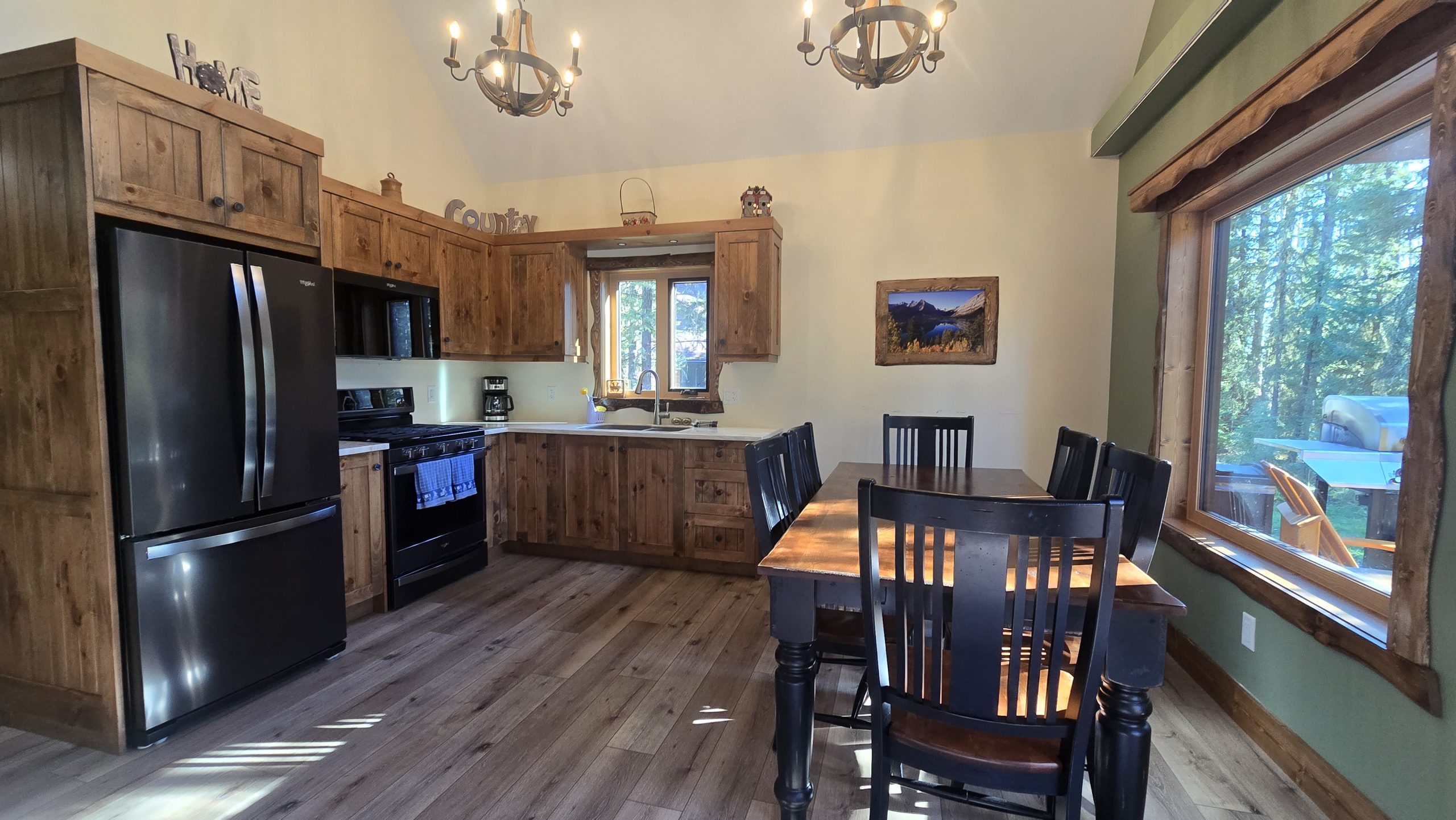 Fully equipped kitchen with fridge with ice-maker, microwave, stove, dining area.
