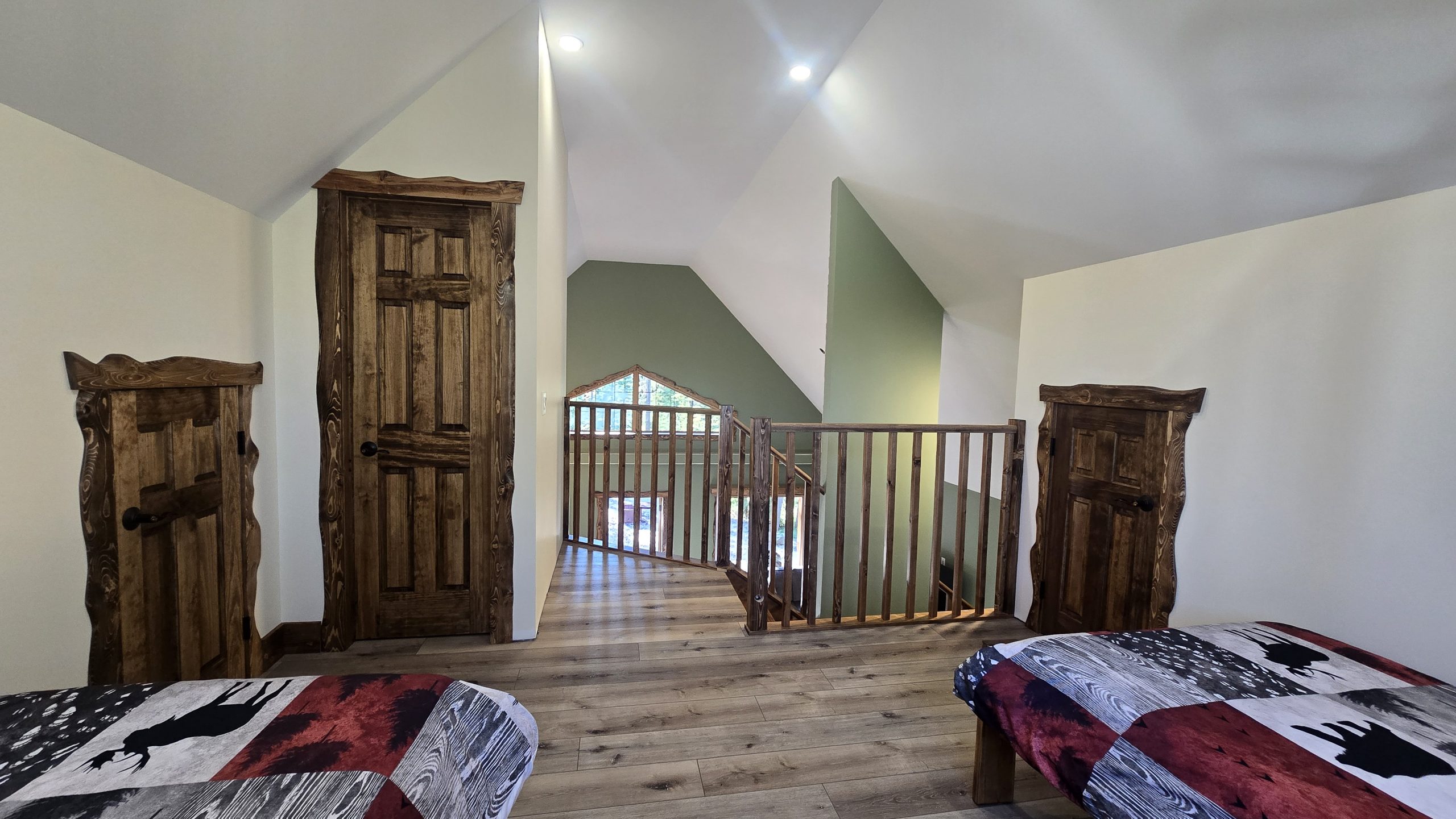 2 bedrooms on the main floor, one with 2 singles and 1 with a queen. loft with ladder and 2 single beds. Duvets and Towels are provided.