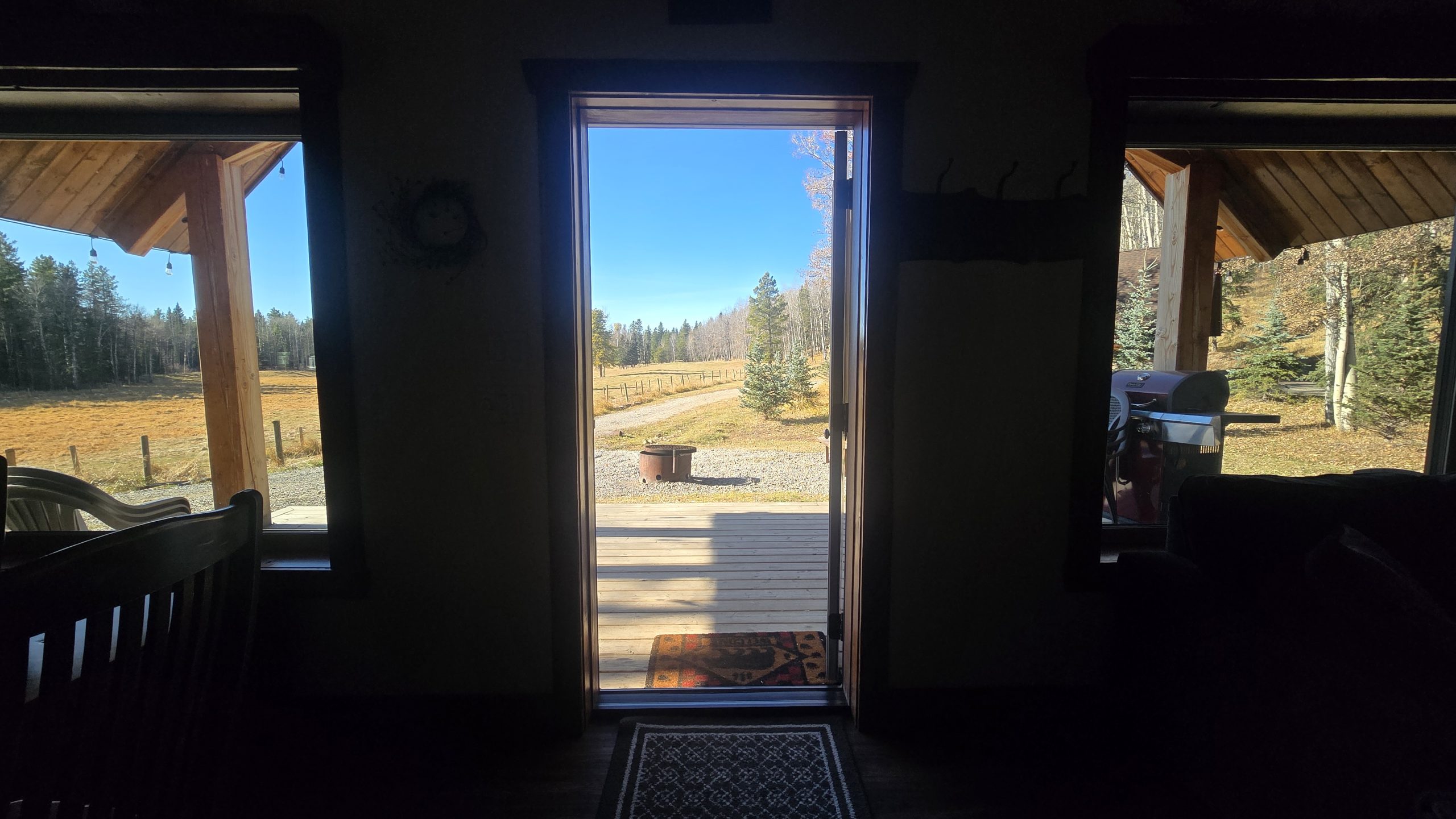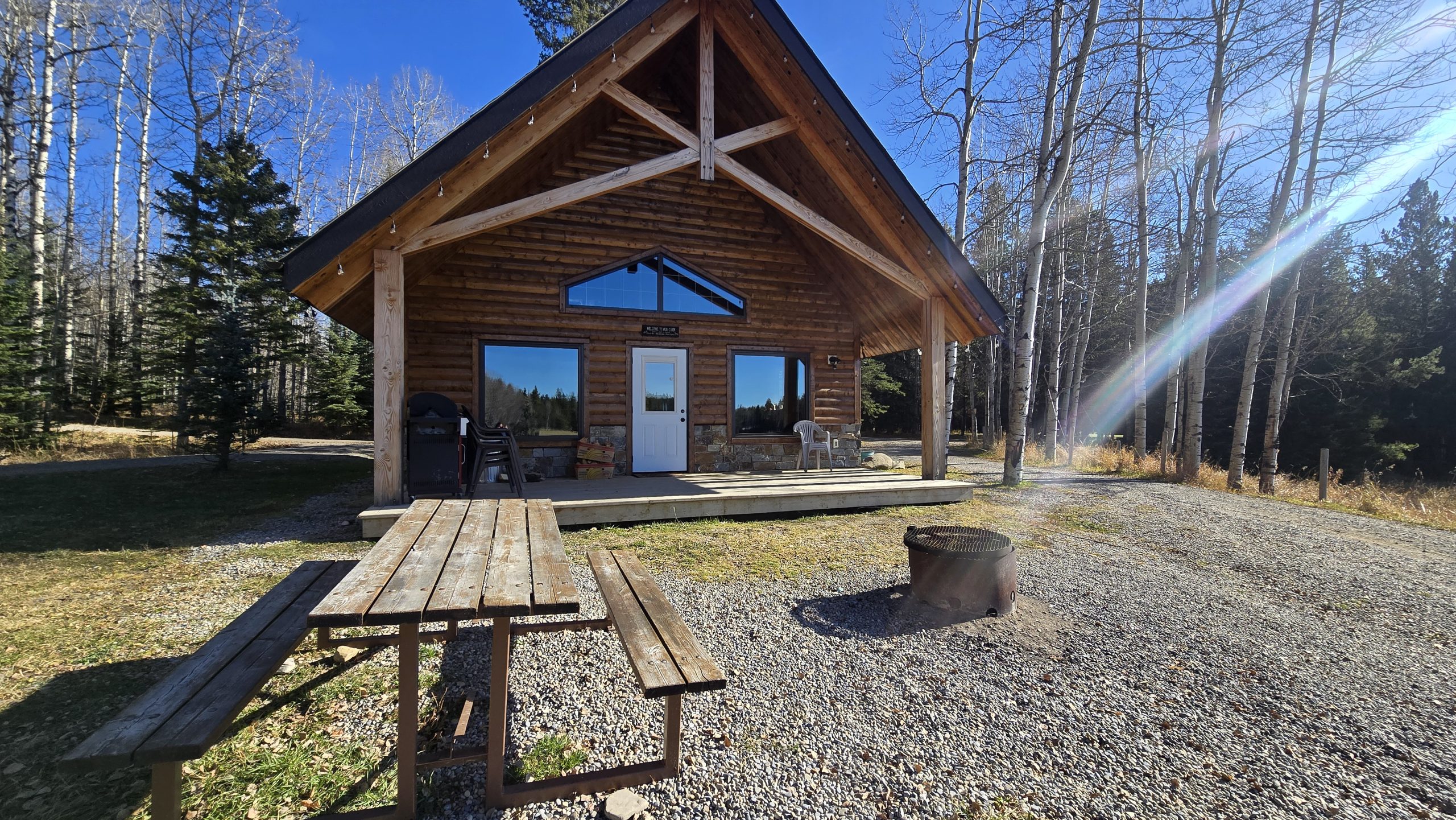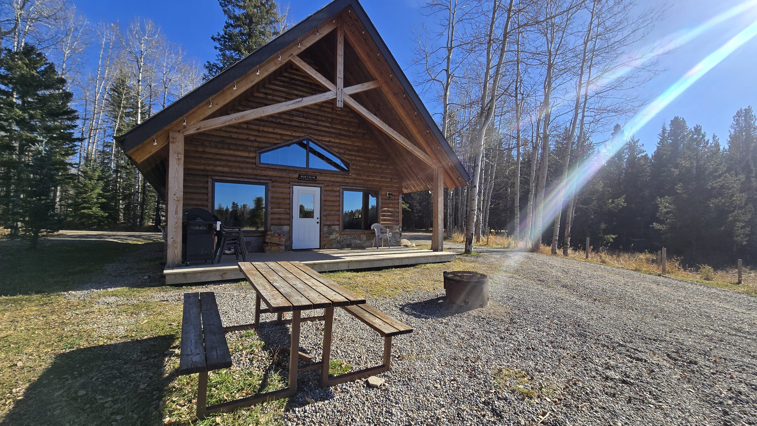 Fire pit and picnic table in front of the cabin, parking space beside the cabin.