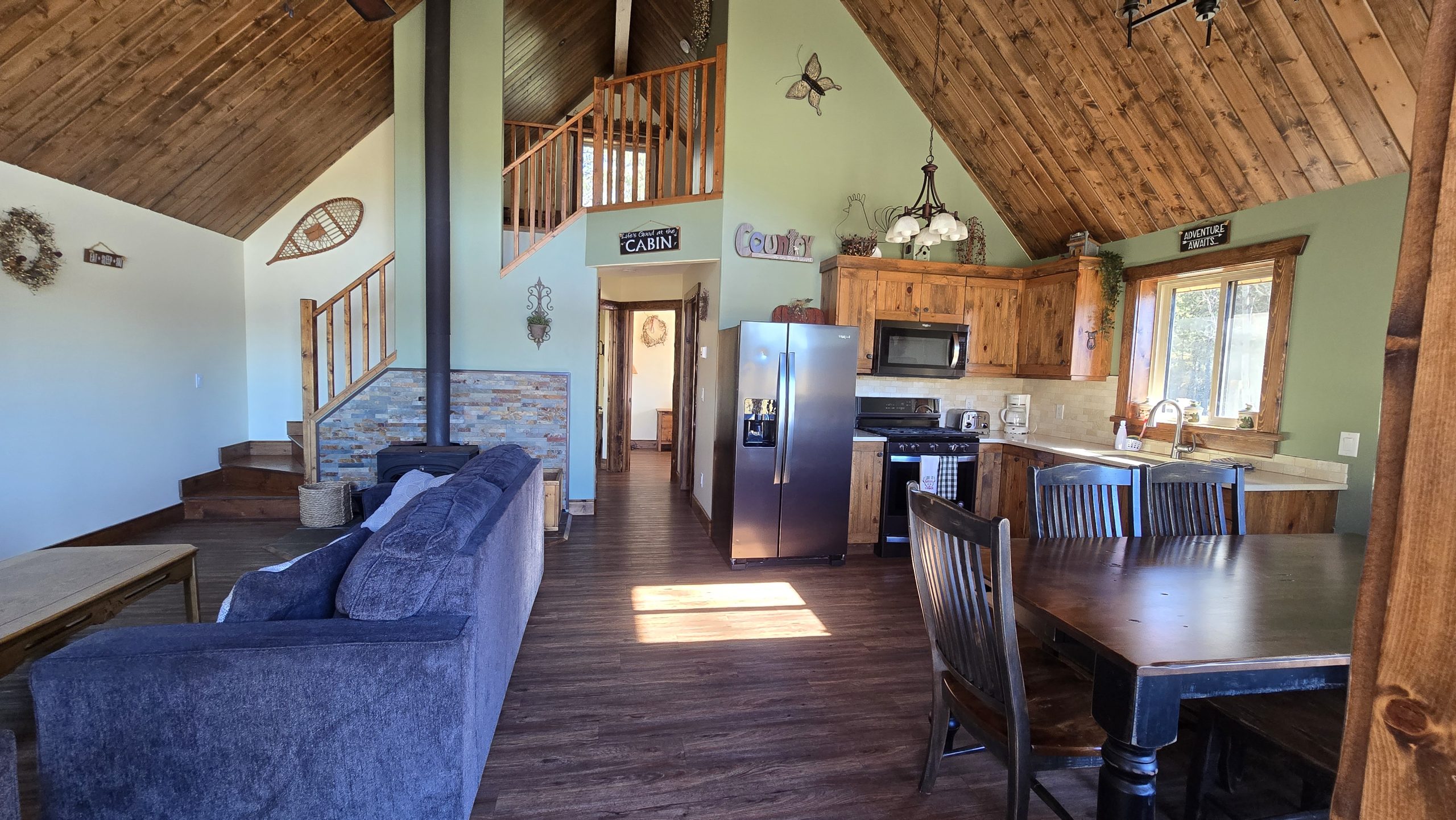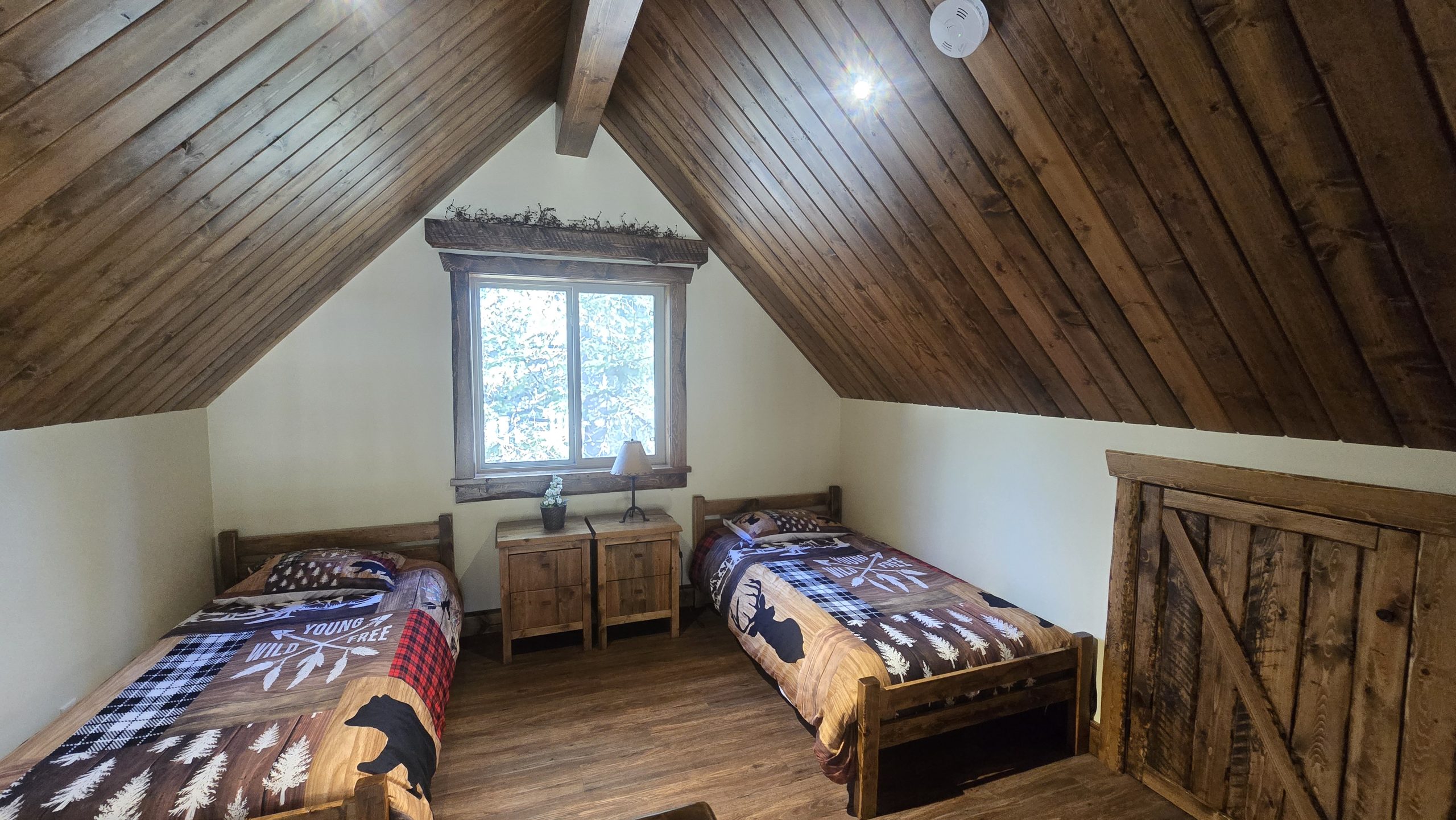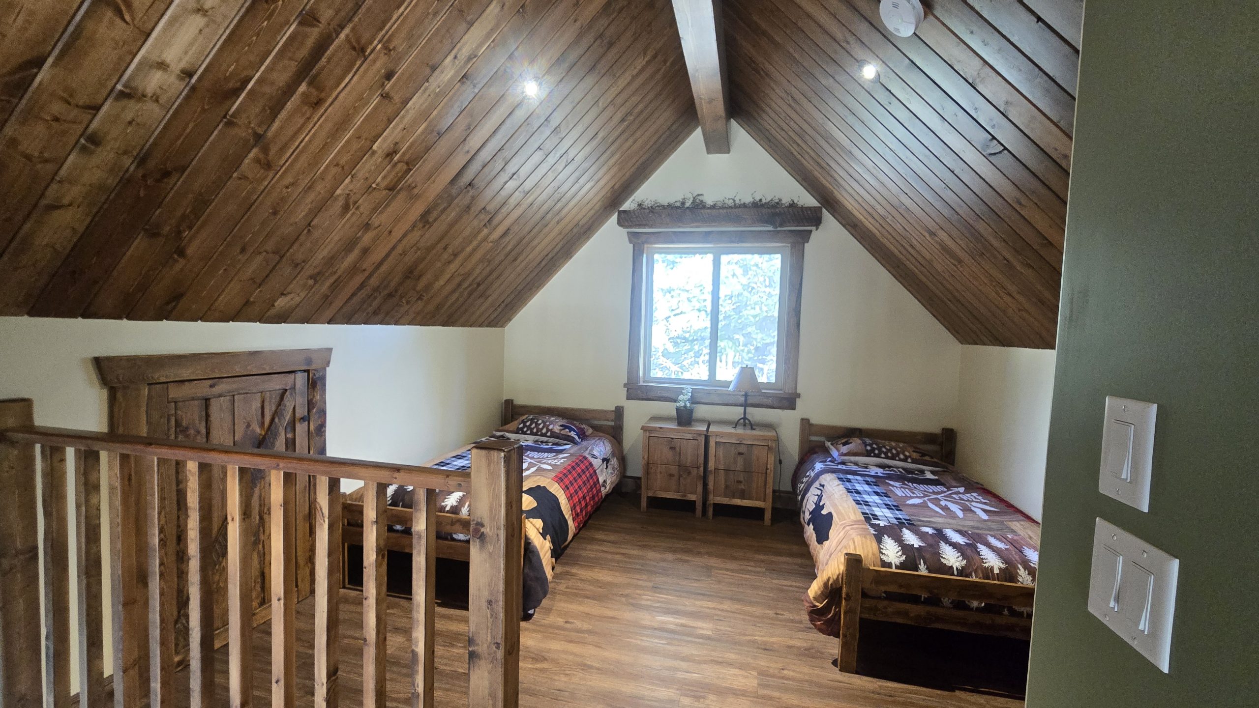 This beautiful luxury cabin offers everything you need for a relaxing and unforgettable stay. Enjoy the comfort of running water and a spacious three piece bathroom featuring a Jacuzzi tub with a heated backrest and soft LED lighting for the perfect evening unwind. The main floor includes two cozy bedrooms, one with a queen bed and another with two single beds, and a charming loft reached by a staircase that holds two more single beds, ideal for families or groups of friends. The fully equipped kitchen has everything you need for your favorite meals, including a propane cook stove, microwave, and fridge with an ice maker. Gather around the dining table for good food and great company, then settle into the comfortable living room and relax by the warmth of the wood stove. Firewood is available for purchase at the office, and satellite TV is provided for your entertainment. Step outside onto your private ten by twenty four foot deck to take in the peaceful surroundings. Enjoy a barbecue, share stories around the fire pit, or relax at the picnic table under the stars. With convenient parking and direct access to our scenic trail system, this cabin is the perfect blend of comfort, adventure, and nature. Duvets and towels are provided so you can simply arrive, settle in, and feel right at home.