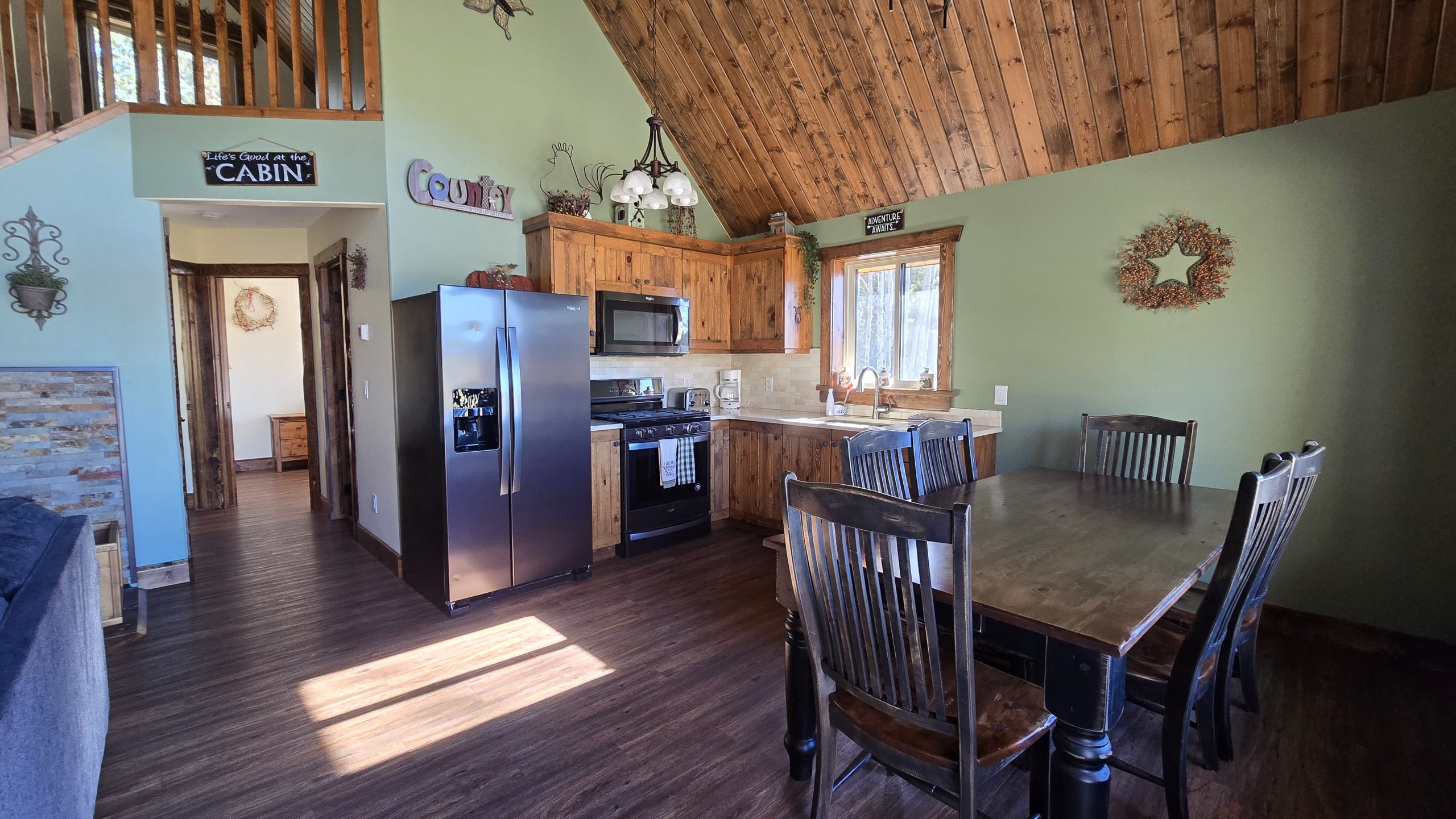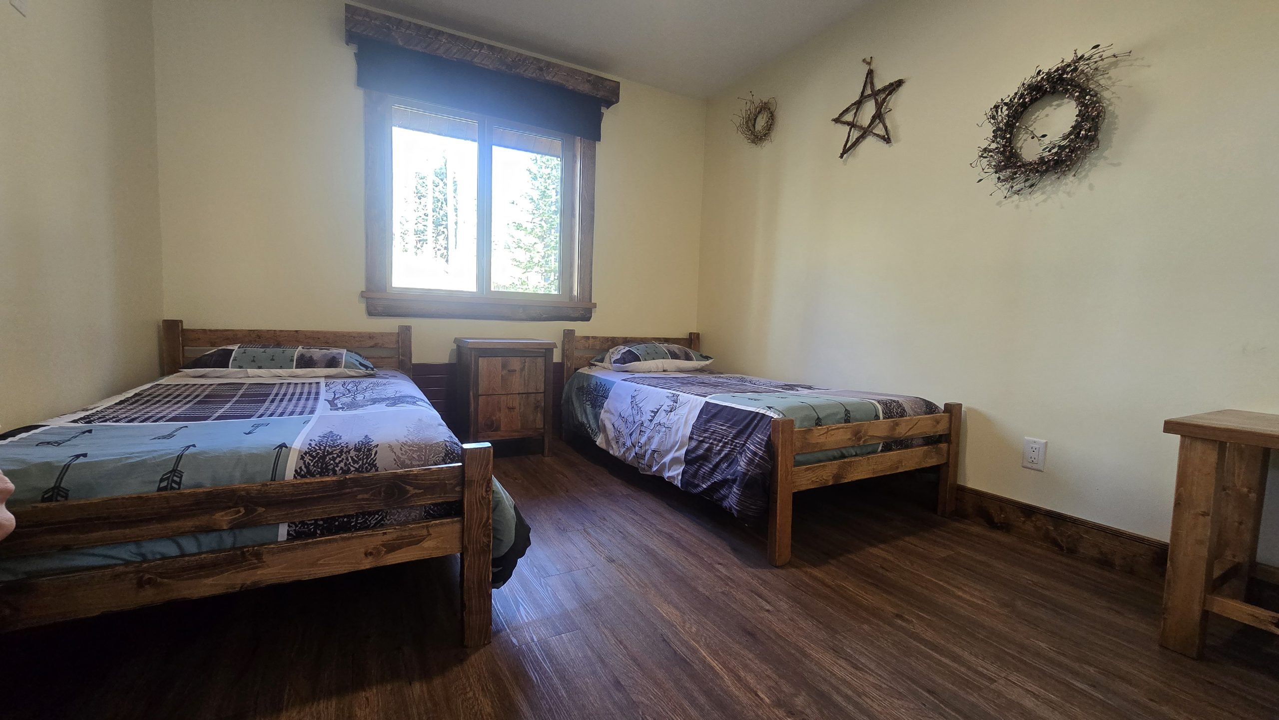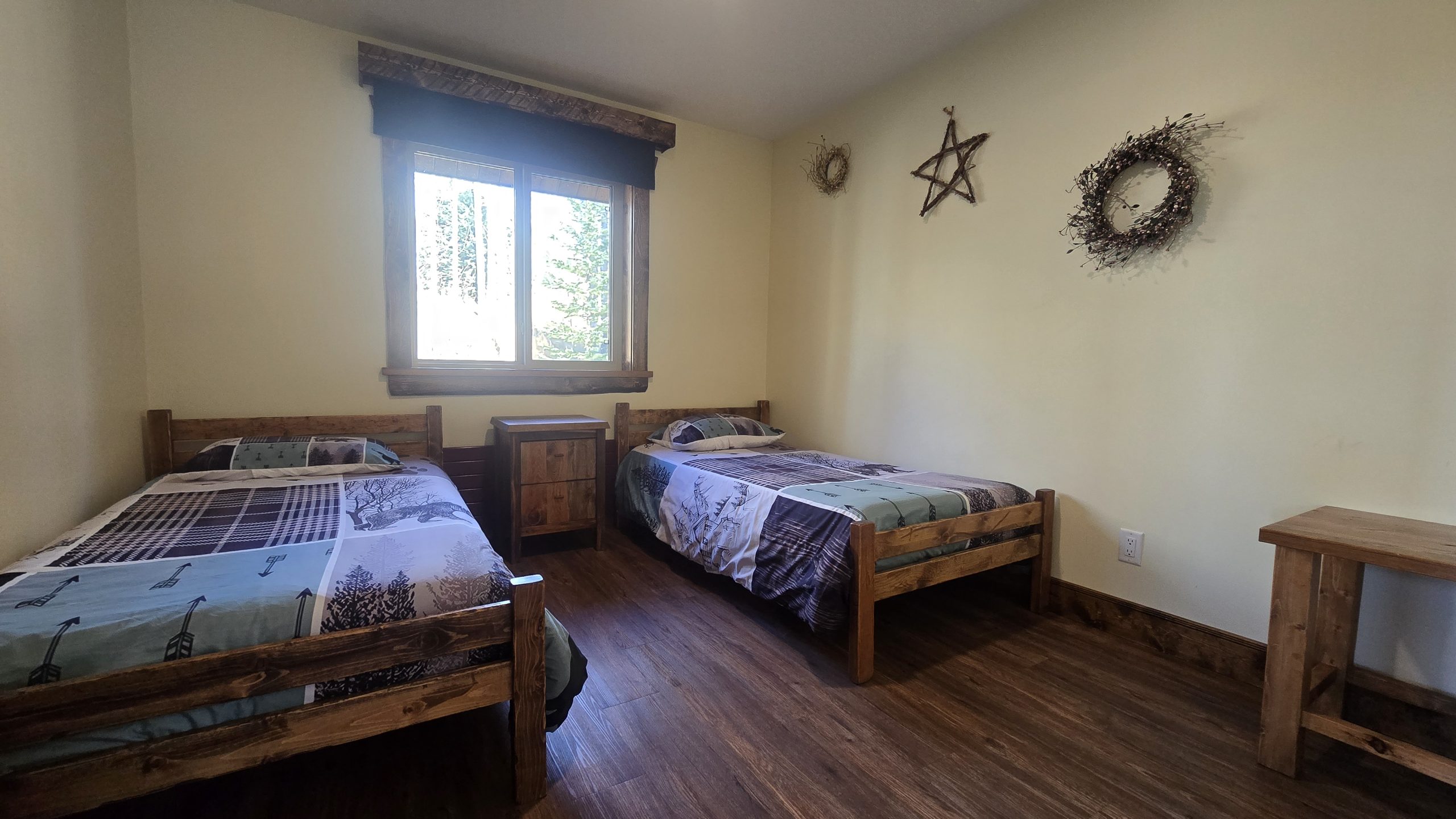 This beautiful luxury cabin offers everything you need for a relaxing and unforgettable stay. Enjoy the comfort of running water and a spacious three piece bathroom featuring a Jacuzzi tub with a heated backrest and soft LED lighting for the perfect evening unwind. The main floor includes two cozy bedrooms, one with a queen bed and another with two single beds, and a charming loft reached by a staircase that holds two more single beds, ideal for families or groups of friends. The fully equipped kitchen has everything you need for your favorite meals, including a propane cook stove, microwave, and fridge with an ice maker. Gather around the dining table for good food and great company, then settle into the comfortable living room and relax by the warmth of the wood stove. Firewood is available for purchase at the office, and satellite TV is provided for your entertainment. Step outside onto your private ten by twenty four foot deck to take in the peaceful surroundings. Enjoy a barbecue, share stories around the fire pit, or relax at the picnic table under the stars. With convenient parking and direct access to our scenic trail system, this cabin is the perfect blend of comfort, adventure, and nature. Duvets and towels are provided so you can simply arrive, settle in, and feel right at home.