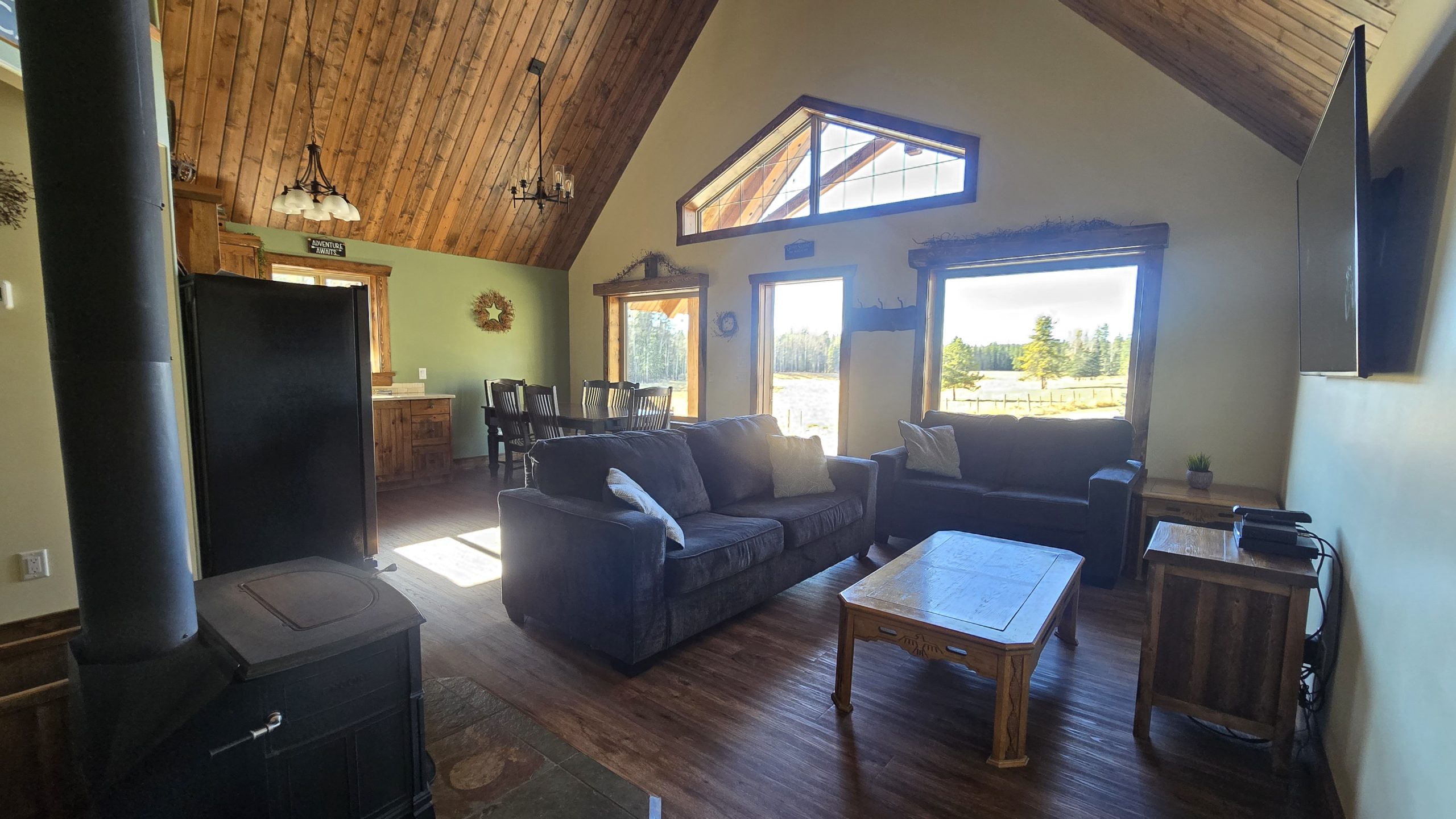 Comfortable living room with satellite TV and wood stove (fire wood is available at the office for extra cost)