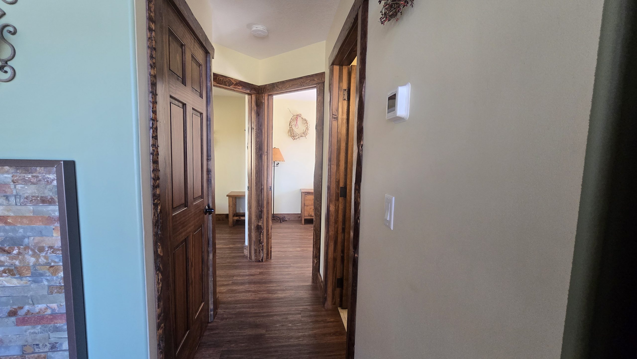 2 bedrooms on the main floor (1 room with queen size bed and 1 room with 2 single beds), stair case up to the loft , loft has 2 single beds. Duvets and Towels are provided.