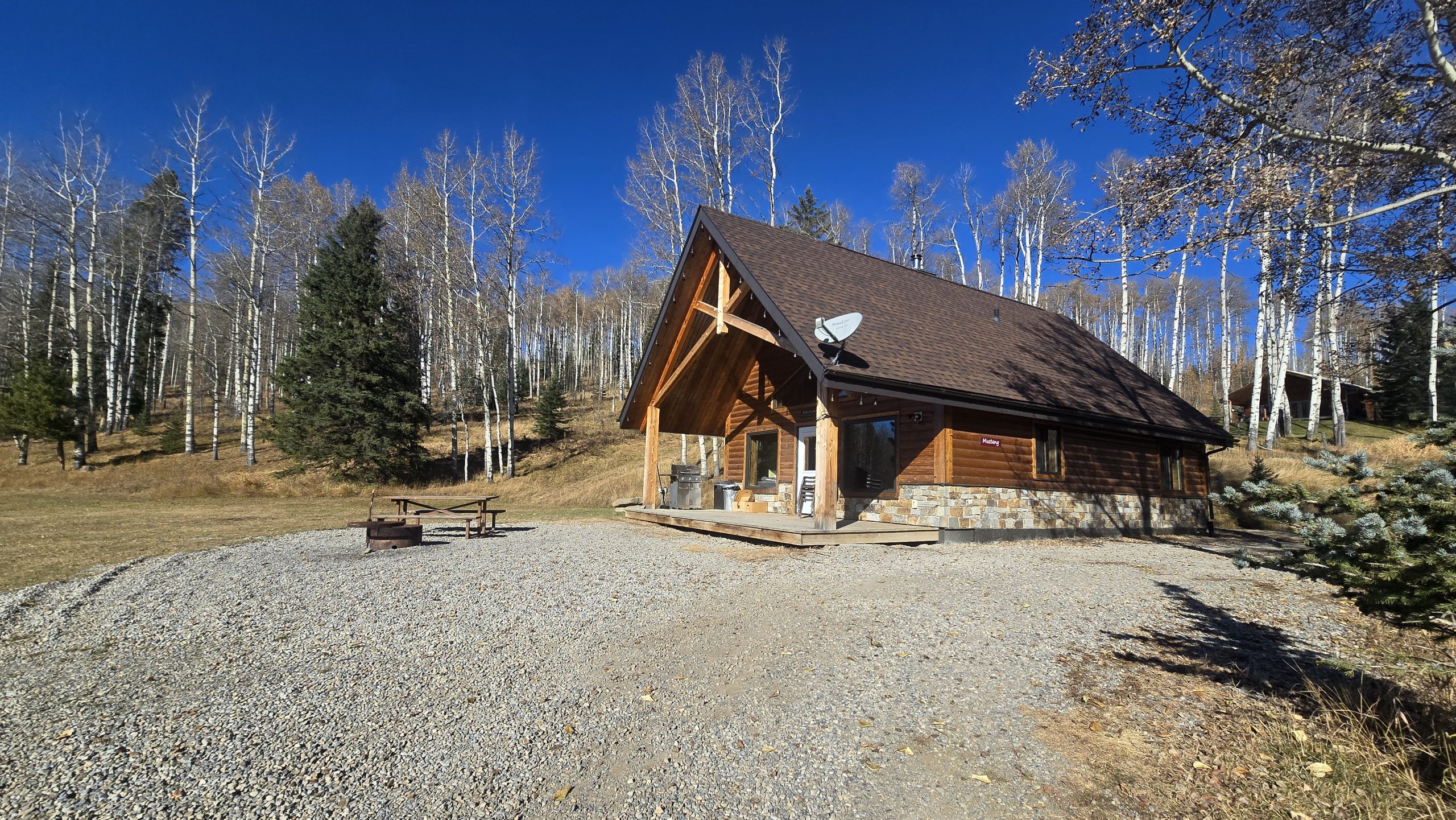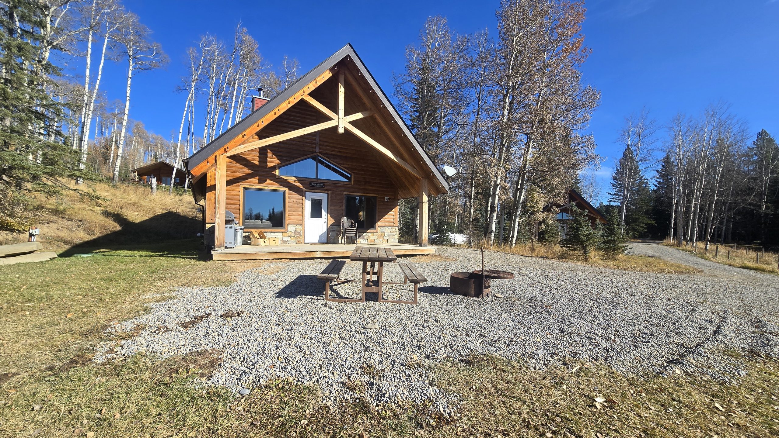 Fire pit and picnic table in front of the cabin, parking space beside the cabin.