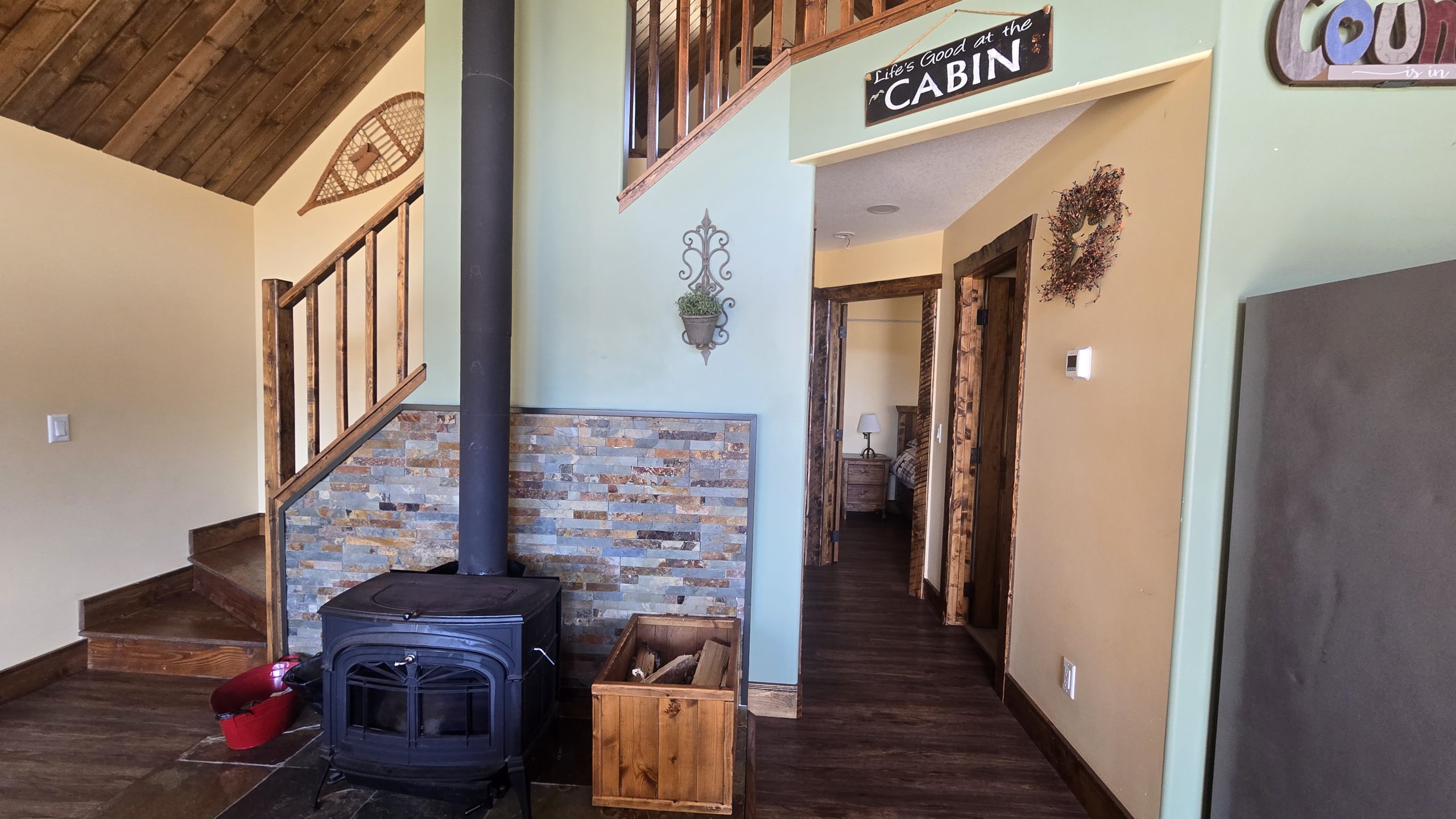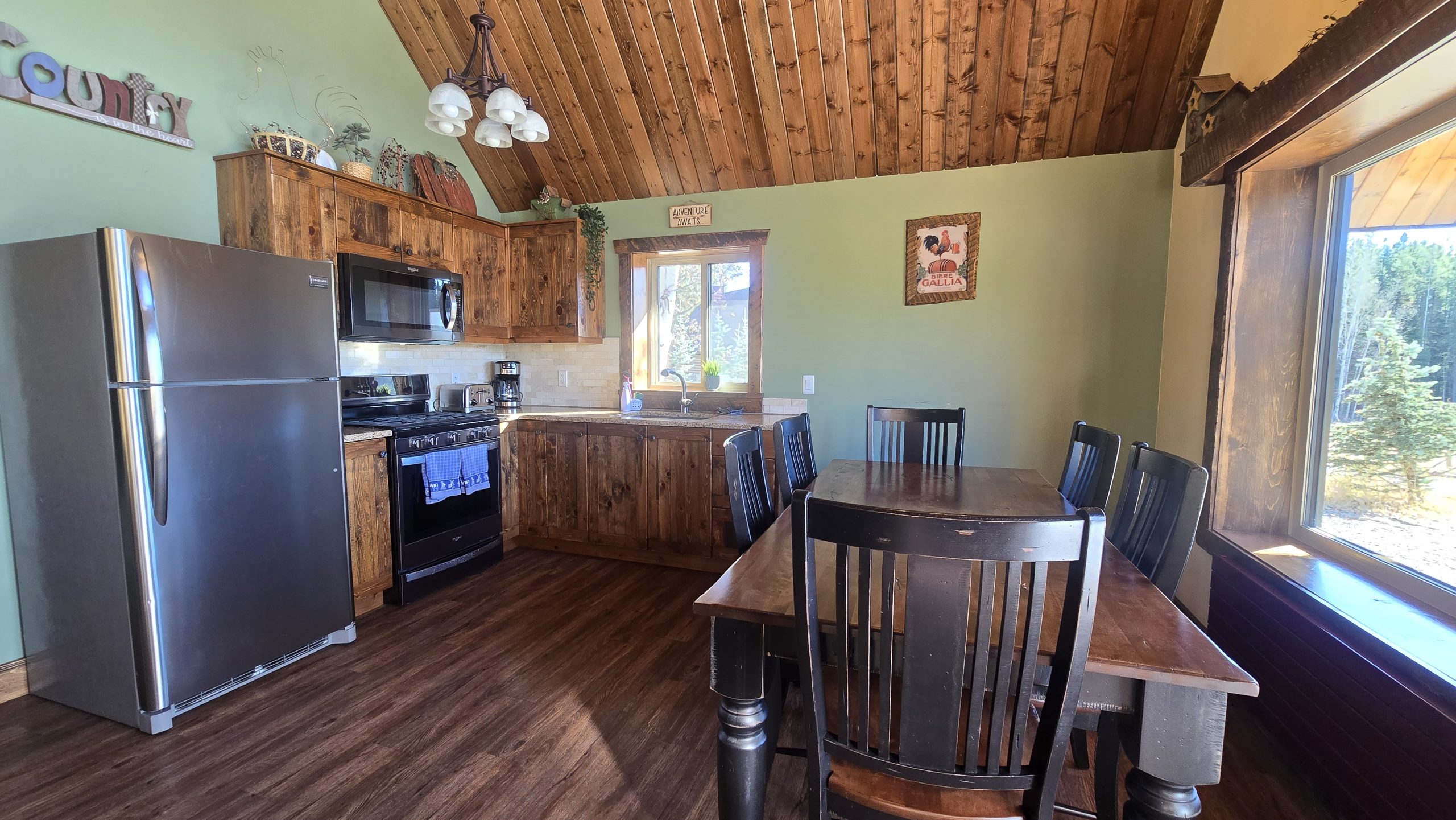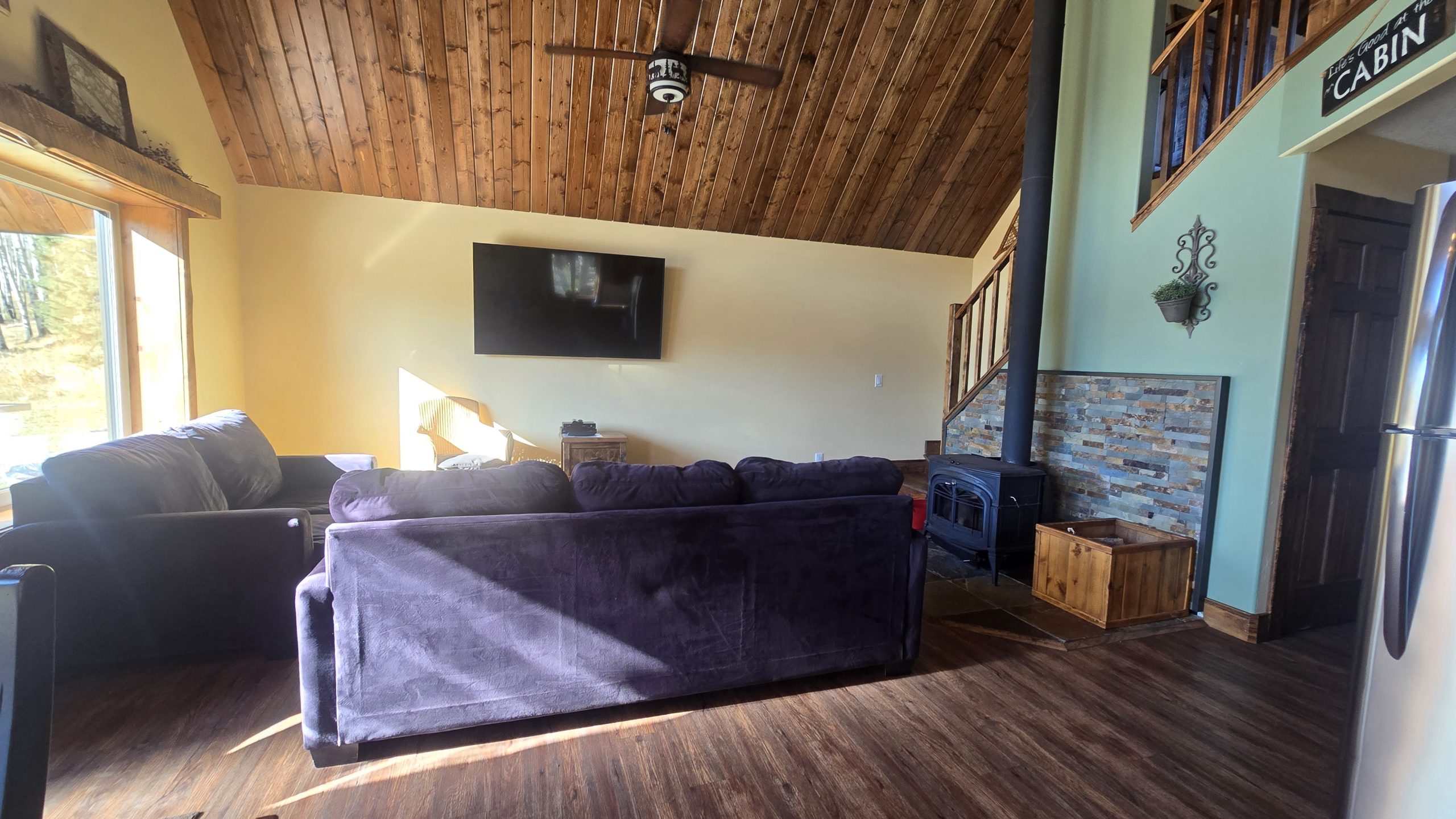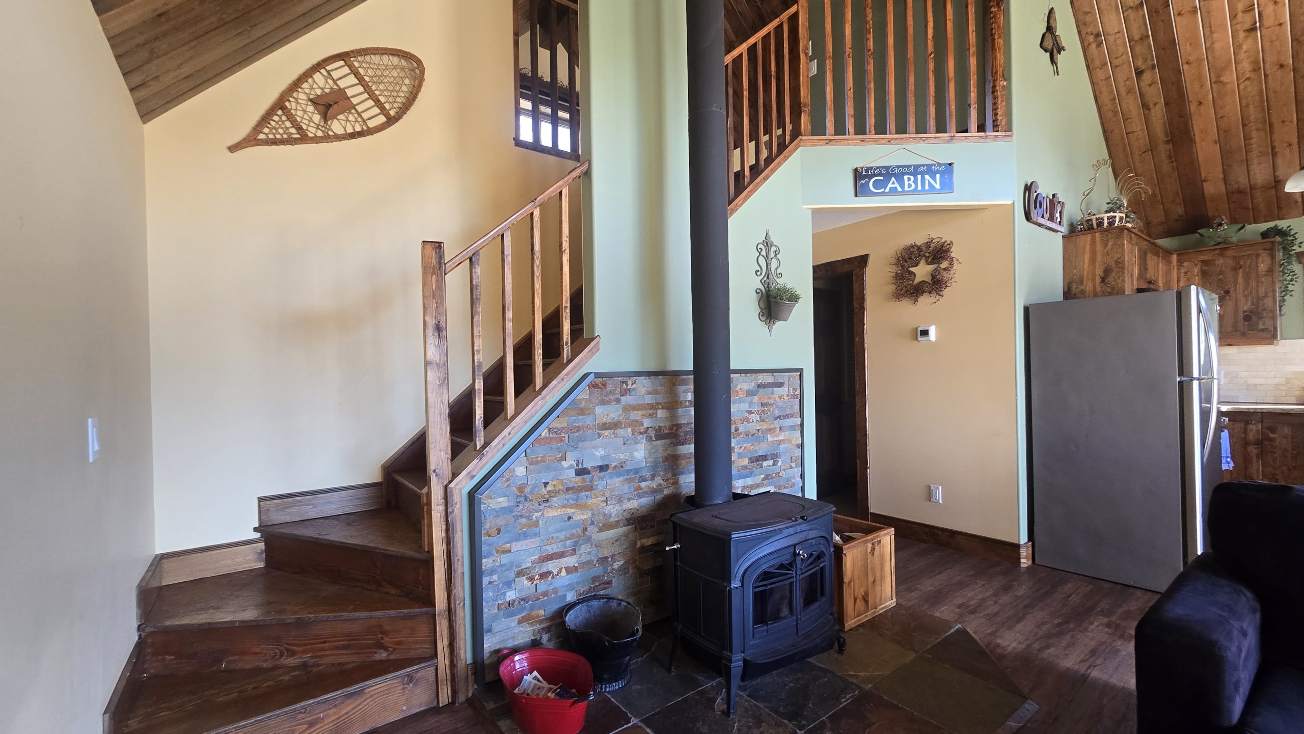 This beautiful luxury cabin welcomes you with warmth, comfort, and rustic charm. Enjoy the ease of running water and unwind in a spacious three piece bathroom featuring a relaxing Jacuzzi tub with a heated backrest. The main floor includes two cozy bedrooms, one with a queen bed and one with two single beds, while the staircase leads to a peaceful loft with two more single beds, perfect for families or friends. The fully equipped kitchen has everything you need for home cooked meals, including a gas stove, microwave, and fridge with an ice maker. Gather around the dining table to share food and laughter, or relax in the comfortable living room by the wood stove after a day of exploring. Firewood is available for purchase at the office, and satellite TV is included for your entertainment. Step outside onto your private ten by twenty four foot deck to enjoy the fresh mountain air. Cook on the barbecue, sit around the fire pit, or have a meal at the picnic table while taking in the peaceful scenery. With convenient parking and direct access to our scenic trail system, this cabin offers the perfect mix of adventure, relaxation, and comfort. Duvets and towels are provided, so you can simply arrive, settle in, and make yourself at home.