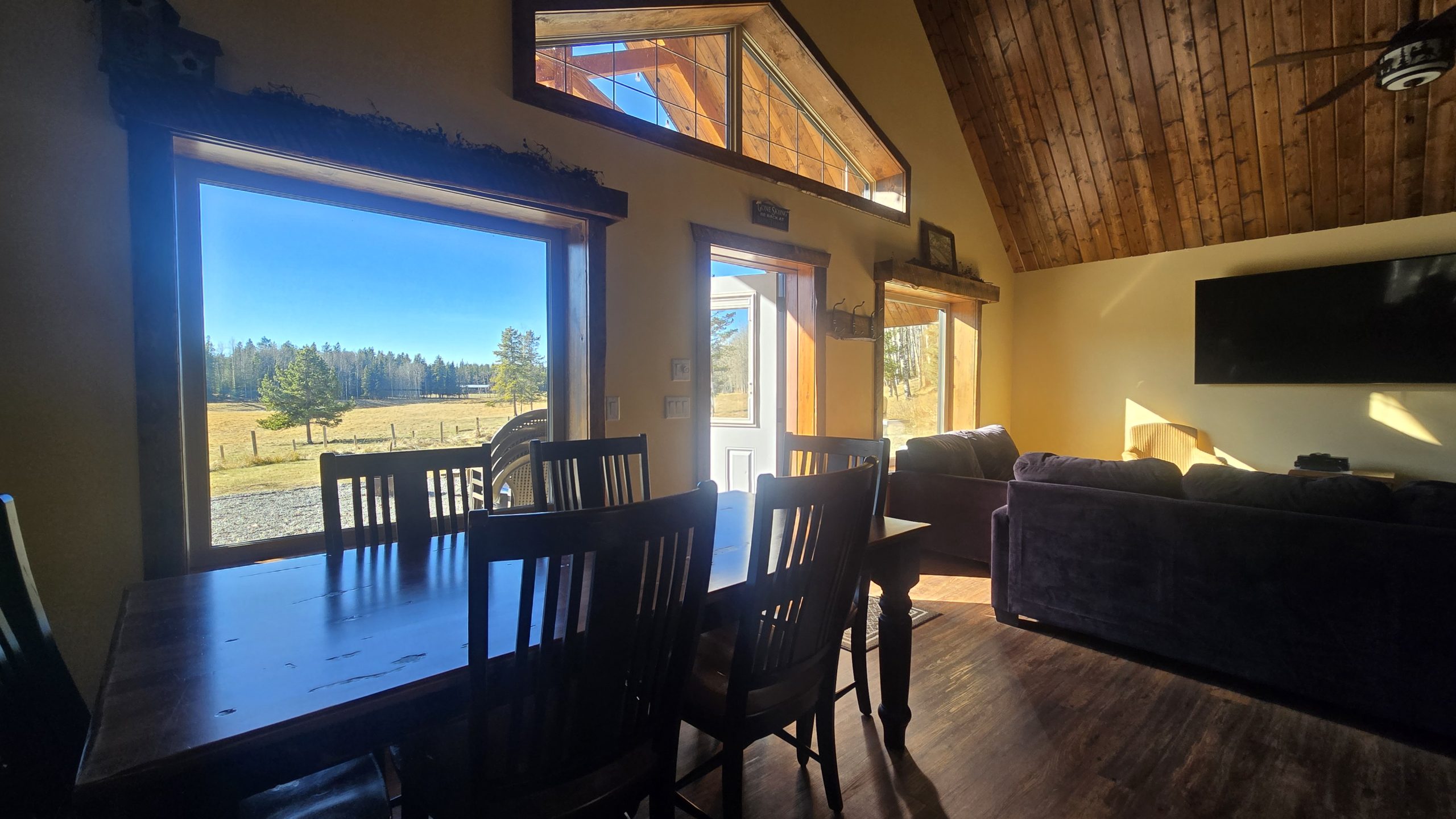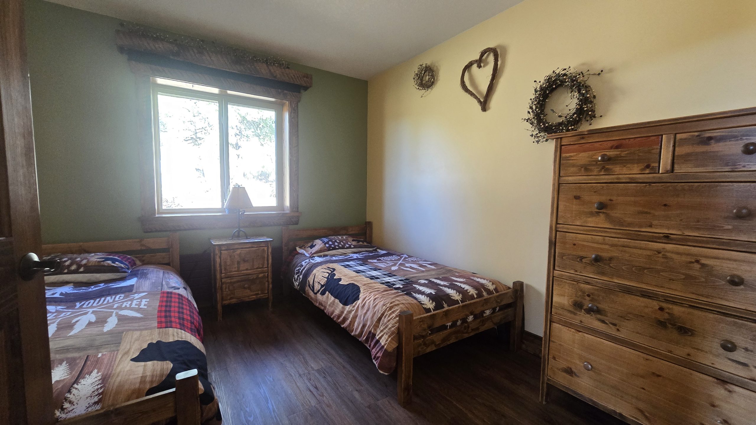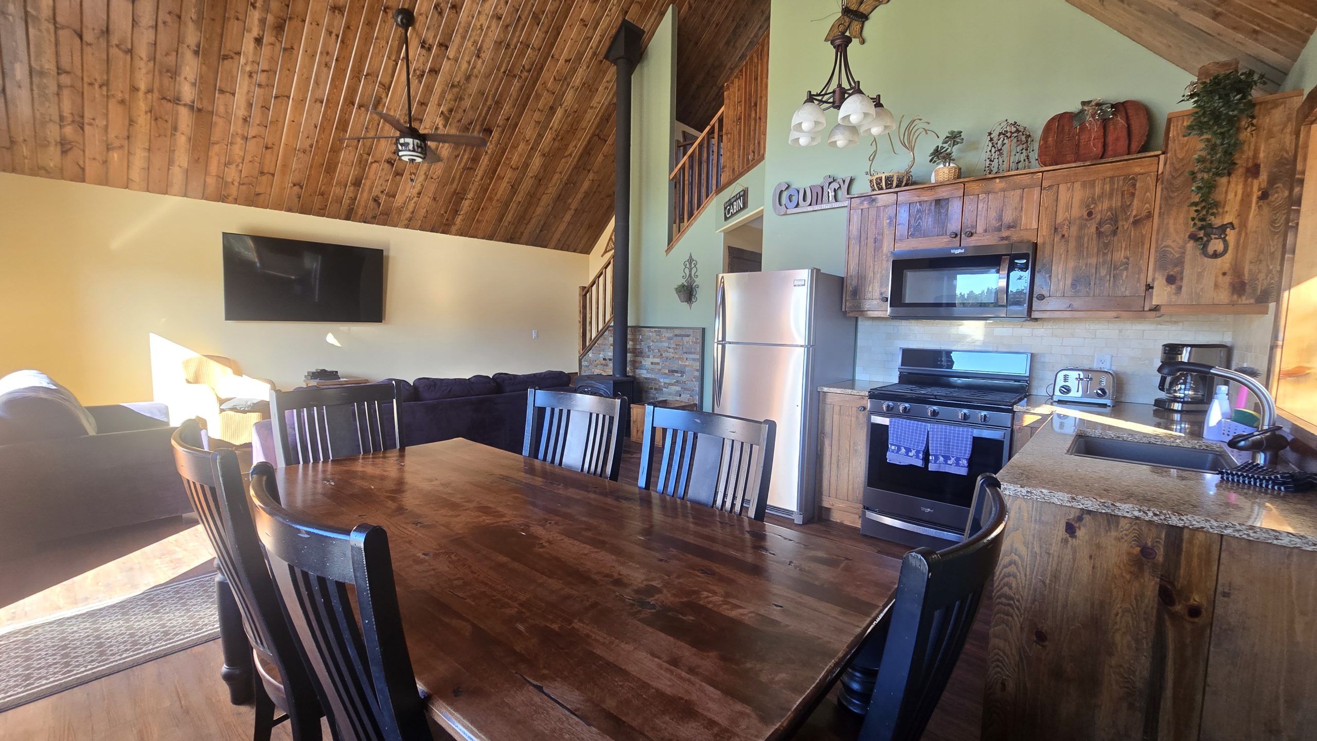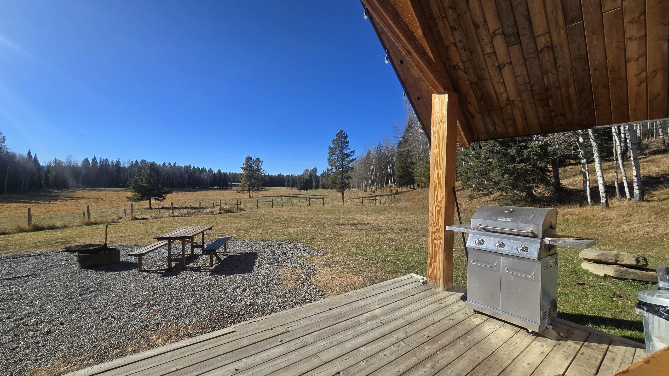 This beautiful luxury cabin welcomes you with warmth, comfort, and rustic charm. Enjoy the ease of running water and unwind in a spacious three piece bathroom featuring a relaxing Jacuzzi tub with a heated backrest. The main floor includes two cozy bedrooms, one with a queen bed and one with two single beds, while the staircase leads to a peaceful loft with two more single beds, perfect for families or friends. The fully equipped kitchen has everything you need for home cooked meals, including a gas stove, microwave, and fridge with an ice maker. Gather around the dining table to share food and laughter, or relax in the comfortable living room by the wood stove after a day of exploring. Firewood is available for purchase at the office, and satellite TV is included for your entertainment. Step outside onto your private ten by twenty four foot deck to enjoy the fresh mountain air. Cook on the barbecue, sit around the fire pit, or have a meal at the picnic table while taking in the peaceful scenery. With convenient parking and direct access to our scenic trail system, this cabin offers the perfect mix of adventure, relaxation, and comfort. Duvets and towels are provided, so you can simply arrive, settle in, and make yourself at home.