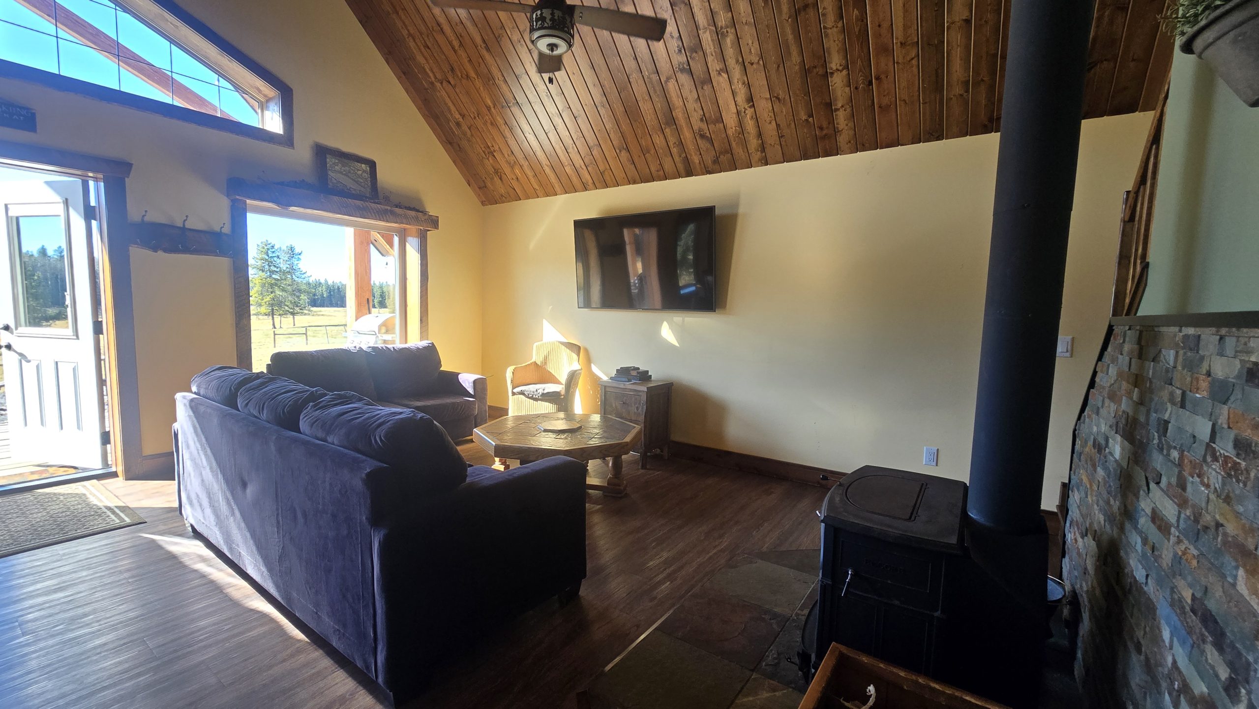 Comfortable living room with satellite TV and wood stove (fire wood is available at the office for extra cost)